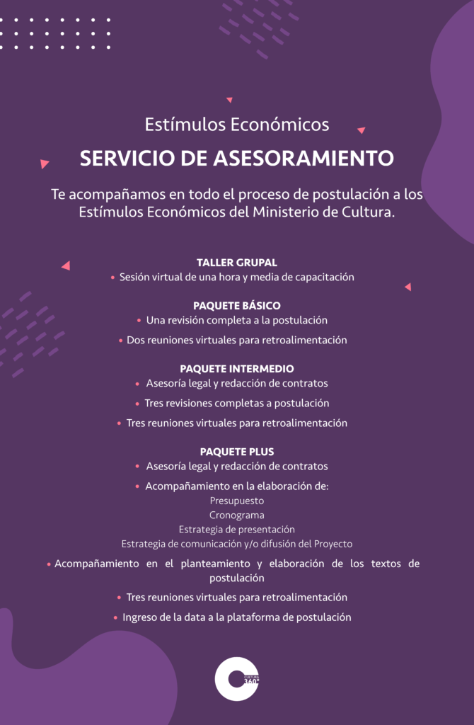 Por tercer año consecutivo, desde Cultura 360, ofreceremos servicios de asesoría para tus postulaciones. Te explicamos más sobre todo el proceso en la siguiente imagen.